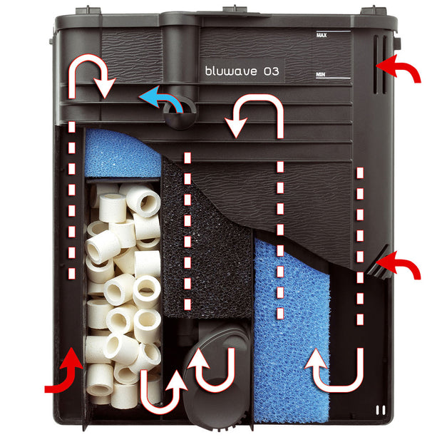 Bluwave ist ein integrierter Aquariumfilter, der drei Filterstufen in einem einzigen Produkt kombiniert: mechanische, biologische und adsorptive Filterung. Durch den Einsatz von porösen Schwämmen erfolgt eine mechanische Filtration. Anschließend erfolgt durch spezielle Keramikringe mit großer Oberfläche und den Kunststoffkugeln Bluballs die biologische Filterung. Darüber hinaus filtert der Aktivkohleschwamm adsorptiv und sorgt für klares, geruchsneutrales Wasser. Die kraftvolle, effiziente und geräuscharme Pico Pumpe filtert bestmöglich: Leistungsstark und dabei mit einem niedrigen Stromverbauch.