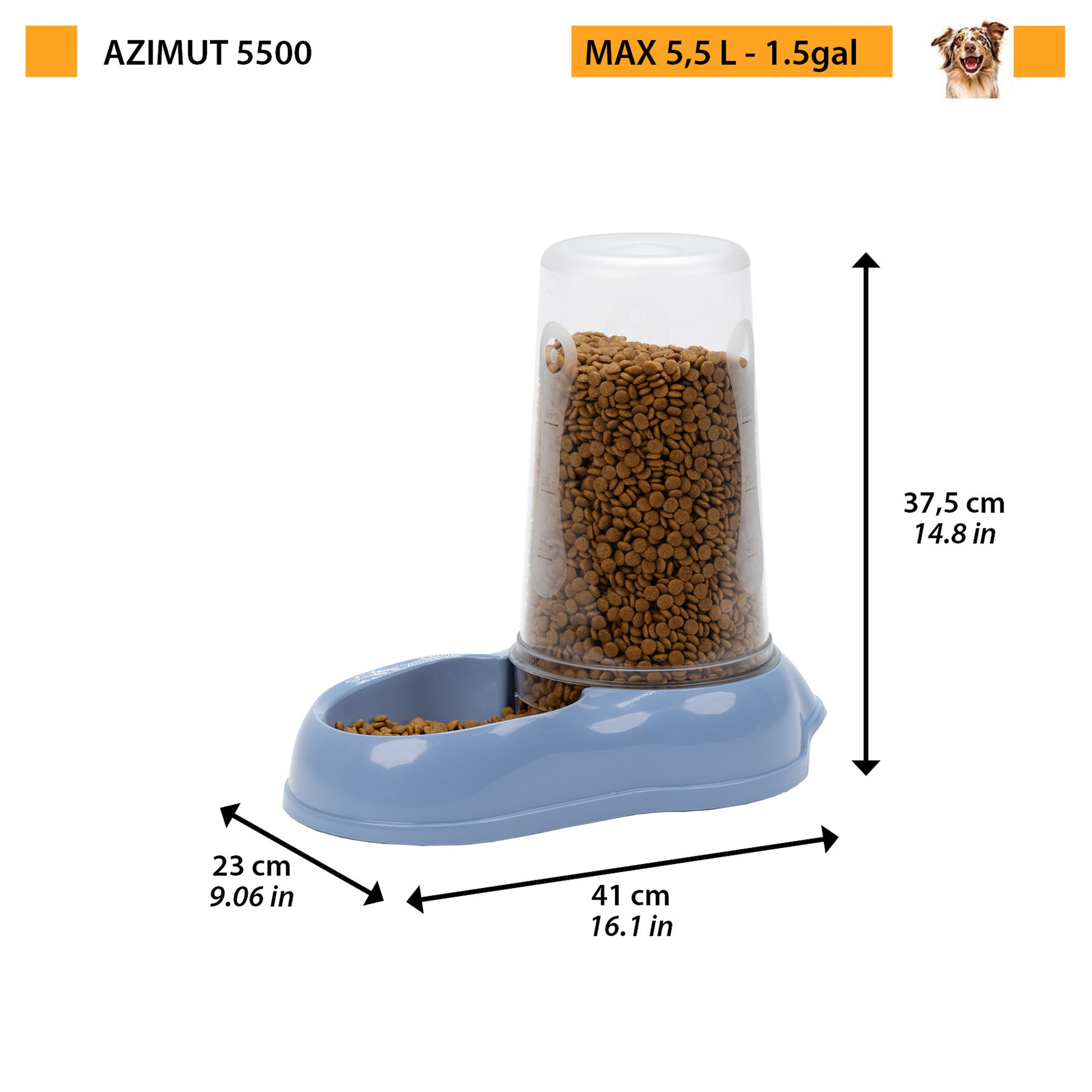 Azimut ist ein handlicher Spender, der für Wasser und Katzen- oder Hundetrockenfutter genutzt werden kann. Aus Kunststoff hergestellt, mit Anti-Rutsch-Gummi und mit einem transparenten Nachfülltank ausgestattet. Für Katzen, Welpen und Hunde geeignet. Azimut ist mit einem transparentem Behälter ausgestattet, der mit einer Kapazitätsanzeige ausgestattet ist. Dieser multifunktionale Spender ist dank seiner Form leicht zu greifen. In 2 verschiedenen Größen erhältlich. 0,6 und 1,5 Liter. Ab jetzt auch in der Maxi Größe von 5,5l erhältlich, ideal für große Katzen und mittelgroße Hunde.