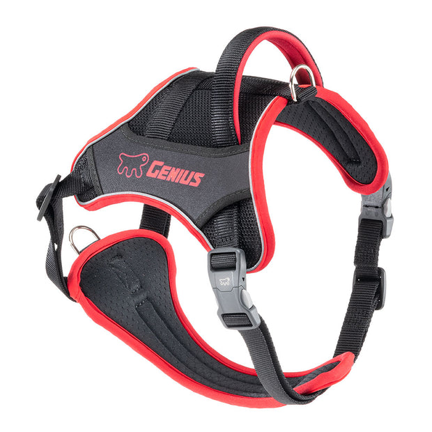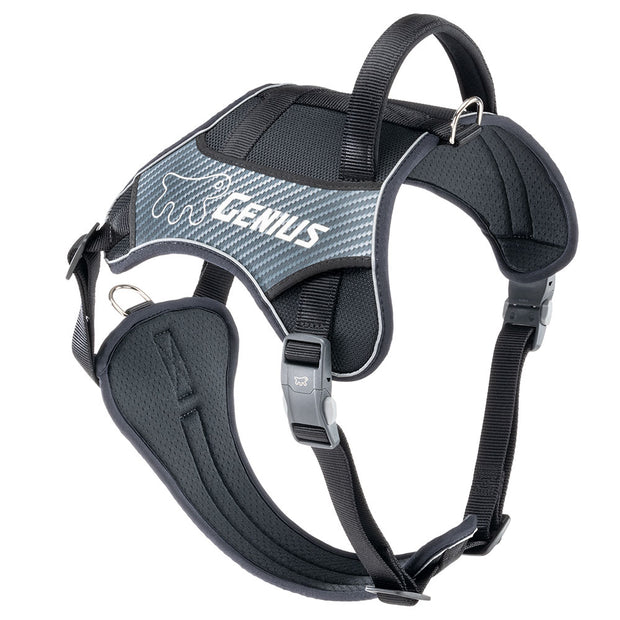 Das Genius-Hundegeschirr besteht aus widerstandsfähigem Nylon, ist auf eine lange Lebensdauer ausgelegt und hält den Zugbelastungen durch das Tier gut stand. Gefüttert mit einer weichen Polsterung und atmungsaktiv, garantieren sie maximalen Komfort für Ihren Vierbeiner und sind leicht an die Statur des Hundes anzupassen. Es ist ideal für Abend- oder Nachtausflüge, da es über nützliche, reflektierende Kanten verfügt, um maximale Sicherheit und Sichtbarkeit zu gewährleisten. Der praktische Griff auf der Rückseite ermöglicht eine effektive Kontrolle des Tieres und erleichtert bei Touren auch die Überwindung besonders schwieriger Hindernisse.
