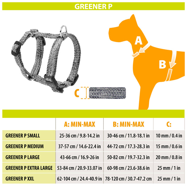Die Greener-Hundegeschirre sind in verschiedenen Größen erhältlich, die für Hunde aller Größen geeignet sind. Jedes Modell unterscheidet sich in der minimalen und maximalen Hals- und Gurtgröße, wodurch eine breite Anpassungsfähigkeit an Hunde mit unterschiedlichem Körperbau gewährleistet ist.