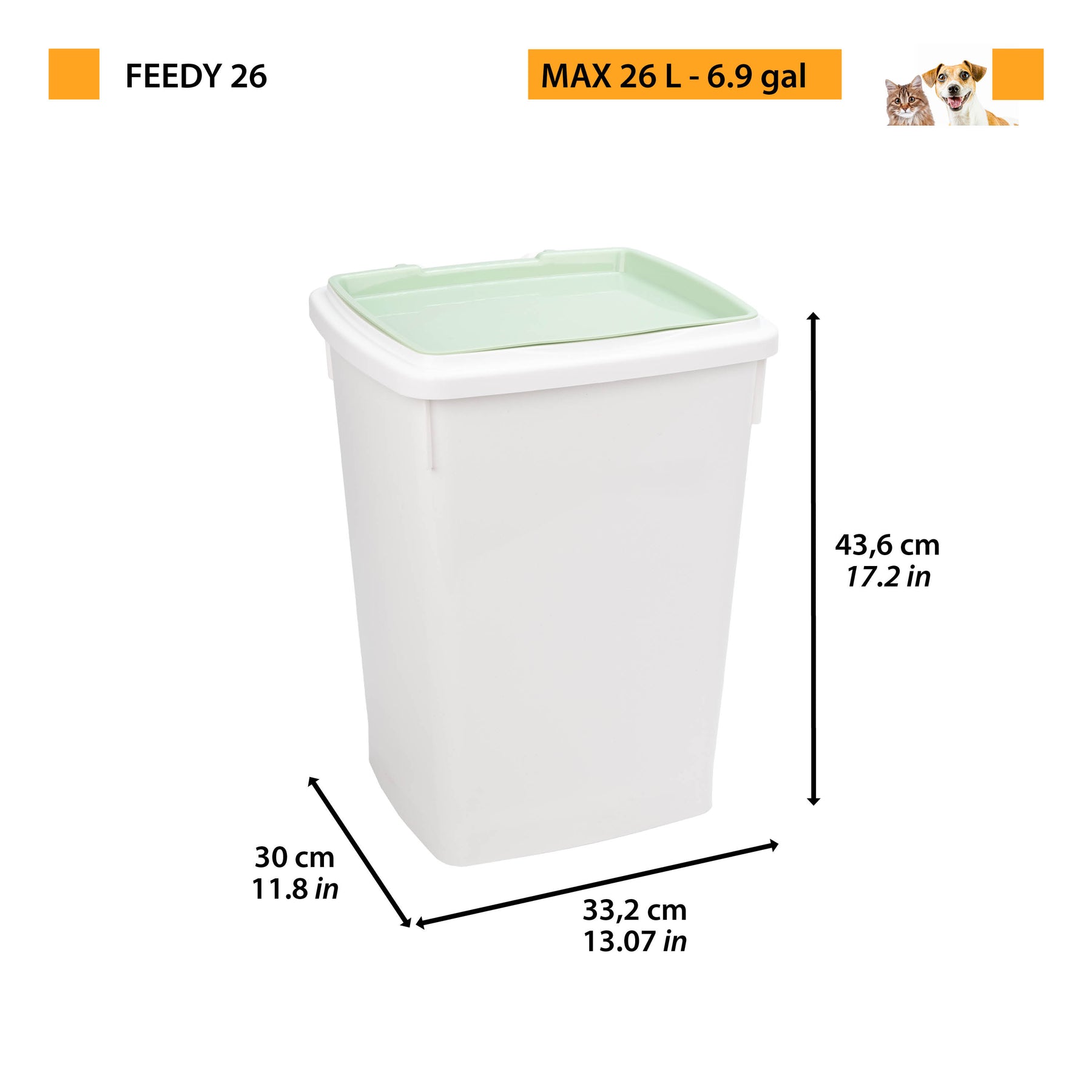 Ein effekiver Weg um Ihr Hundetrockenfutter frisch und knusprig aufzubewahren. Feedy ist ein Kunststoffbehälter für Trockenfutter, Pasta, Reis oder Kekse. Er ist mit einer doppelten Deckelverdichtung ausgestattet, damit die Nahrung frisch bleibt und keine Gerüche austreten. In drei Größen erhältlich: Feedy 13, 26 und 39, die ein Fassungsvermögen von 5, 10 und 15kg haben. Mit Feedy können Sie Futter für einen längeren Zeitraum lagern. Die großzügige, hygienische, Schaufel aus rostfreiem Edelstahl ist mit einem funktionellen Griff ausgestattet und ist äußerst nützlich zur Futterentnahme.