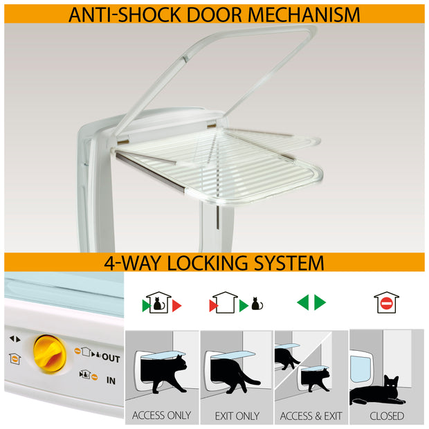 Dank der Ferplast Swing Produkte können Sie die Klappe exklusiv für Ihren vierbeinigen Freund an jeder Holz-, Metall- oder Glastüre sowie an Ziegelwänden anbringen. Für Katzen und Welpen empfehlen wir die Modelle Swing 1, 3 oder 5. Für mittelgroße bis große Hunde, sowie für große Katzen, sind die Modelle 11 und 15 empfehlenswert. Das Modell Swing 7 ist mit einem Magnetsystem ausgestattet und für Katzen perfekt geeignet. Die Klappen werden mit dem innovativen Windstopper-System, welches Schutz vor Zugluft (mit Ausnahme der Modelle Swing 1 und 3 ) bietet, geliefert. Ein weiterer wichtiger Bestandteil ist das 4 -Wege -Verschluss-System (nicht im Swing 1 Modell enthalten), mit dem Sie die Art der Öffnung auf Ihre Bedürfnisse anpassen können: Nur Einstieg, nur Ausstieg, Ein- und Ausstieg oder geschlossen. Der Durchgangsindikator wird Ihnen anzeigen (im Modell Swing 5), ob sich Ihr Haustier innerhalb oder außerhalb des Hauses befindet. Dieser besteht aus einem Flag, der auf der Unterseite der Katzenklappe angebracht ist und zeigt gleichzeitig die Richtung an, in die sich Ihr pelziger Freund zuletzt bewegt hat. Alle größeren Klappen sind mit einem Tunnel ausgestattet, so dass die Klappe an jede Struktur angebracht werden kann. Für das Modell Swing 5 und die Modelle Swing 1 und 3 für kleinere Haustiere, ist eine neue modulare Erweiterung des Tunnels als Zubehör erhältlich. Dieser geht 5 cm in die Tiefe (Schrauben sind nicht enthalten). Wir empfehlen Ihnen vor dem Einbau in Glaskonstruktionen einen Glaser zu befragen, da es nicht möglich ist, Löcher in Sicherheitsglas oder Doppel-Verglasung zu bohren.
