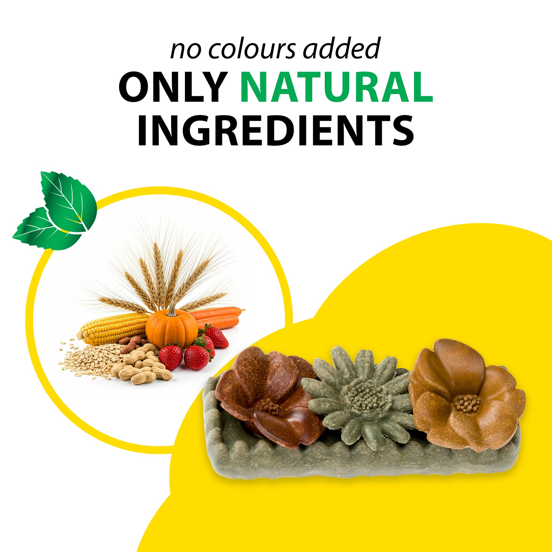 Hergestellt ausschließlich aus Zutaten pflanzlichen Ursprungs, ist Veggie Bites Blumen ein natürliches Leckerli für Kleintiere, ohne zugesetzten Zucker und ohne künstliche Farbstoffe. Die sanften und leuchtenden Farben stammen aus natürlichen Zutaten wie Rose, Ringelblume, Rote Bete und Kurkuma. Der hohe Ballaststoffgehalt ermöglicht eine regelmäßige Gabe im Rahmen einer ausgewogenen Ernährung für pflanzenfressende Kleintiere.