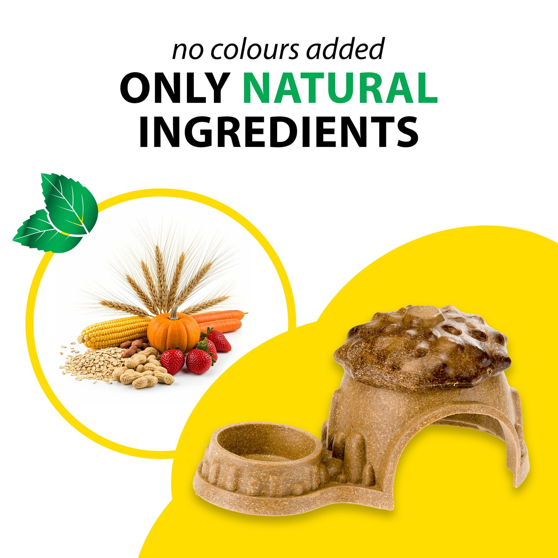 - Nur natürliche Zutaten: Weizenstroh, Haferkleie, Erbsenfasern, Maismehl, Maisstängel, Kürbis, Pflanzliches Glycerin, Maisstärke, Karotte, Luzerne, Erdbeere, Rote Bete, Haematococcus