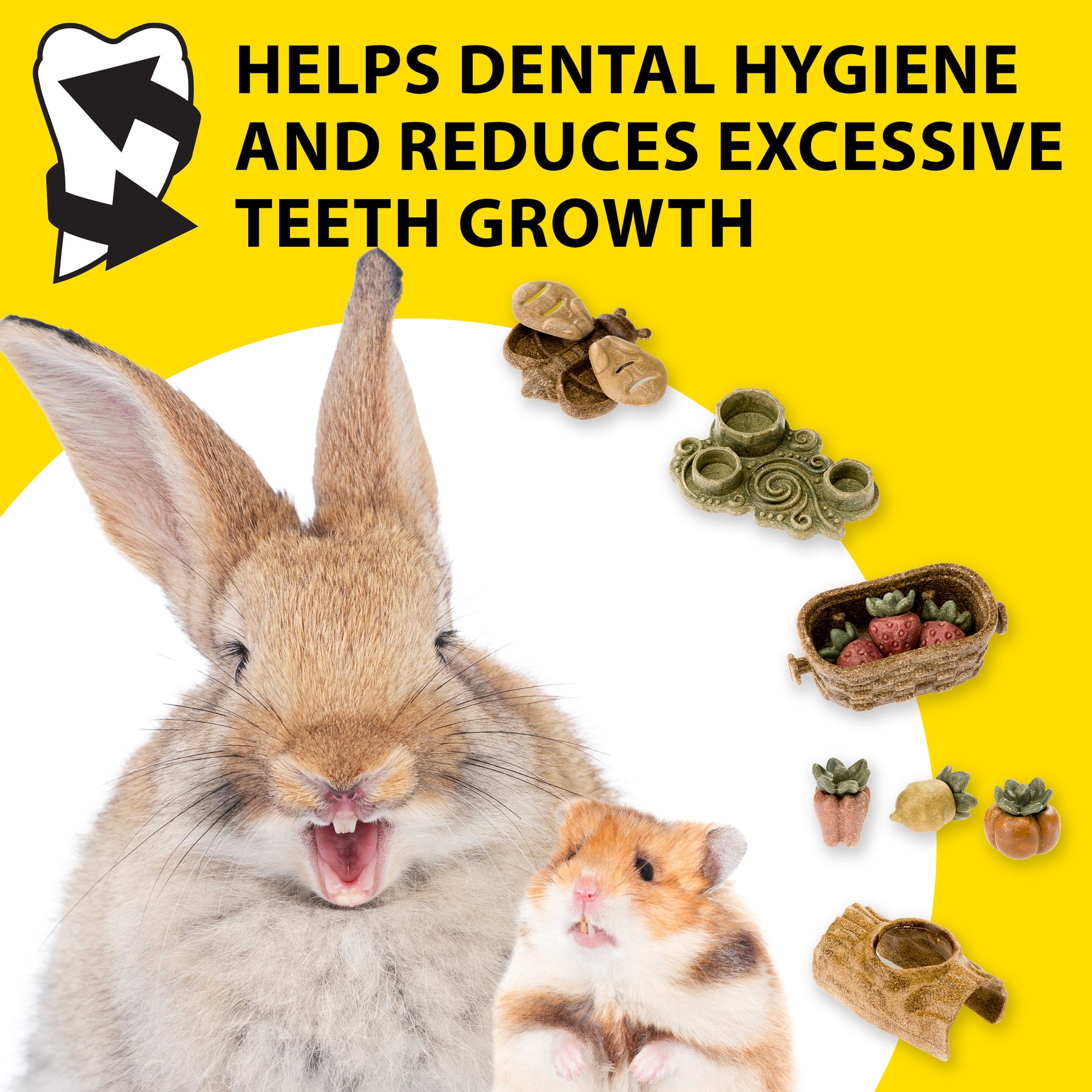 Die harte und knusprige Konsistenz macht Veggie Bites Haus zu einem idealen Kau-Leckerli für Nager, das intensives Nagen fördert. Diese Kaubewegung unterstützt den natürlichen Zahnabrieb, da die Zähne von Nagern und Kaninchen kontinuierlich wachsen. Dadurch eignet sich das Produkt auch als Zahnpflege-Leckerli für Kleintiere.