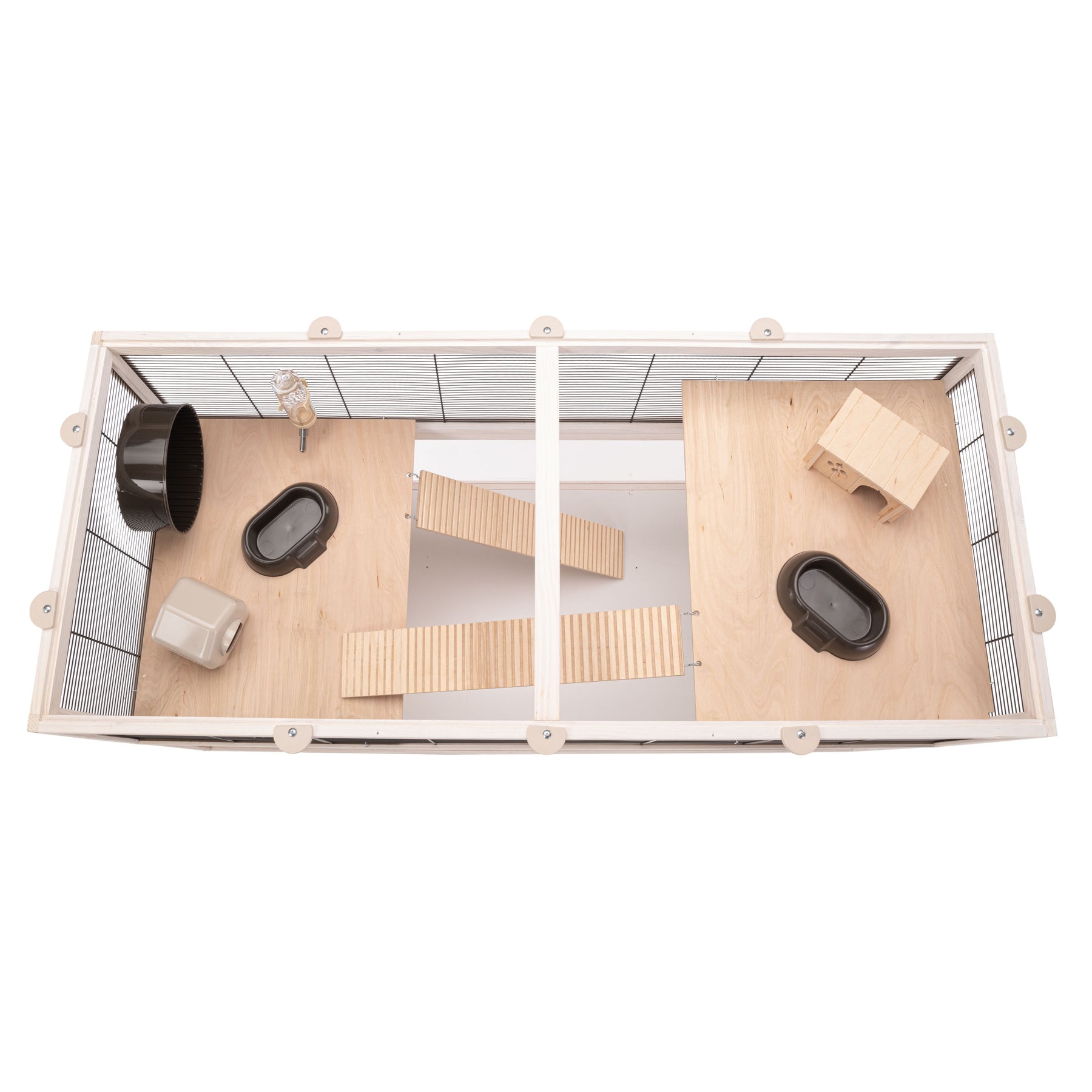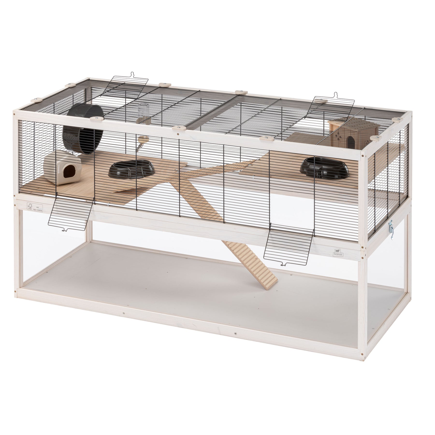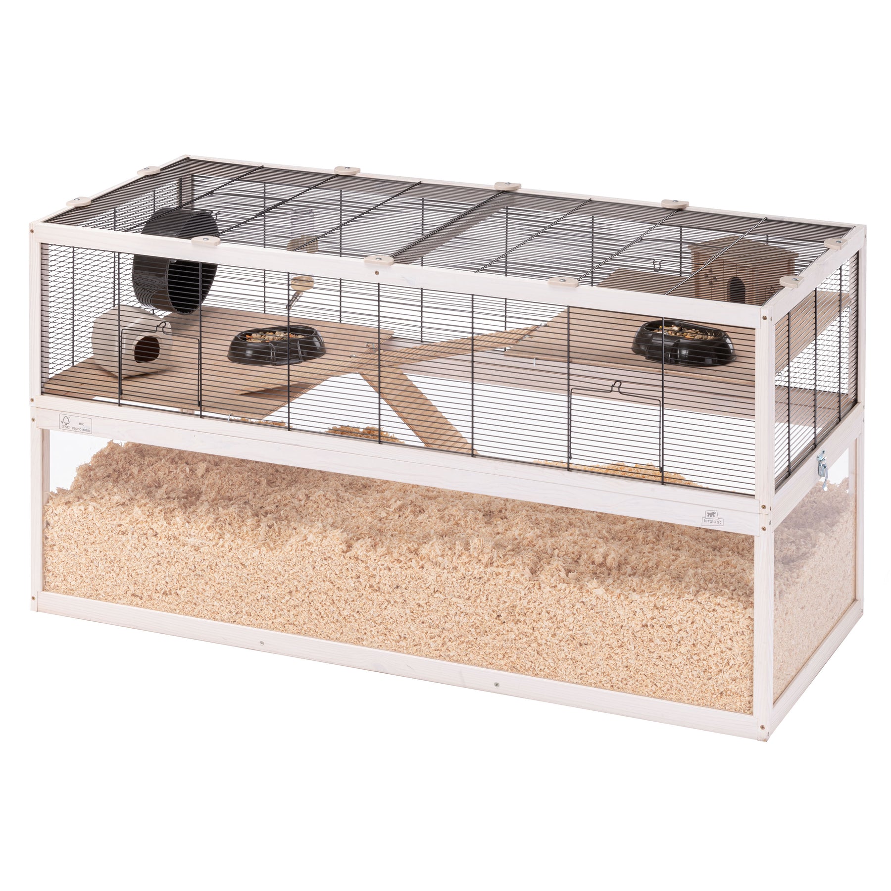 Im Inneren ist jedes Domster-Habitat mit Zubehör ausgestattet, um Ihrem Nagetier den nötigen Komfort zu bieten: Dieses Modell umfasst einen Holzkäfig und einen Kunststoffkäfig zum Ausruhen, zwei Futternäpfe, ein Laufrad für die Bewegung und eine Trinkflasche mit Ausguss aus Edelstahl.