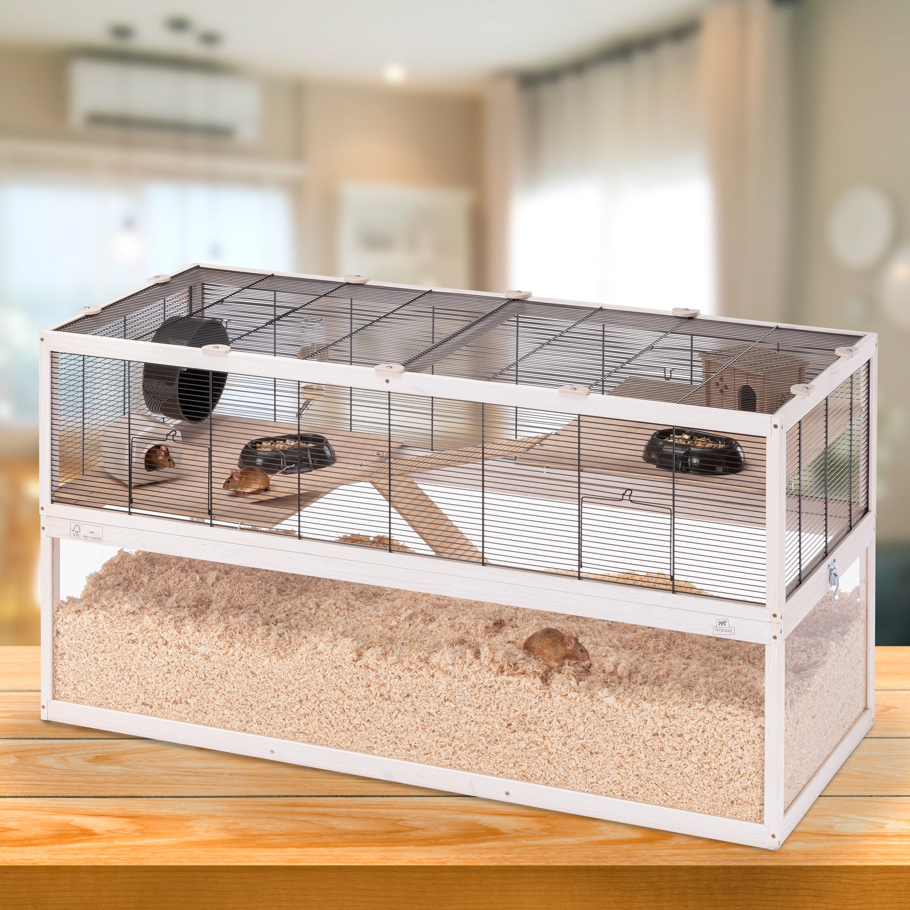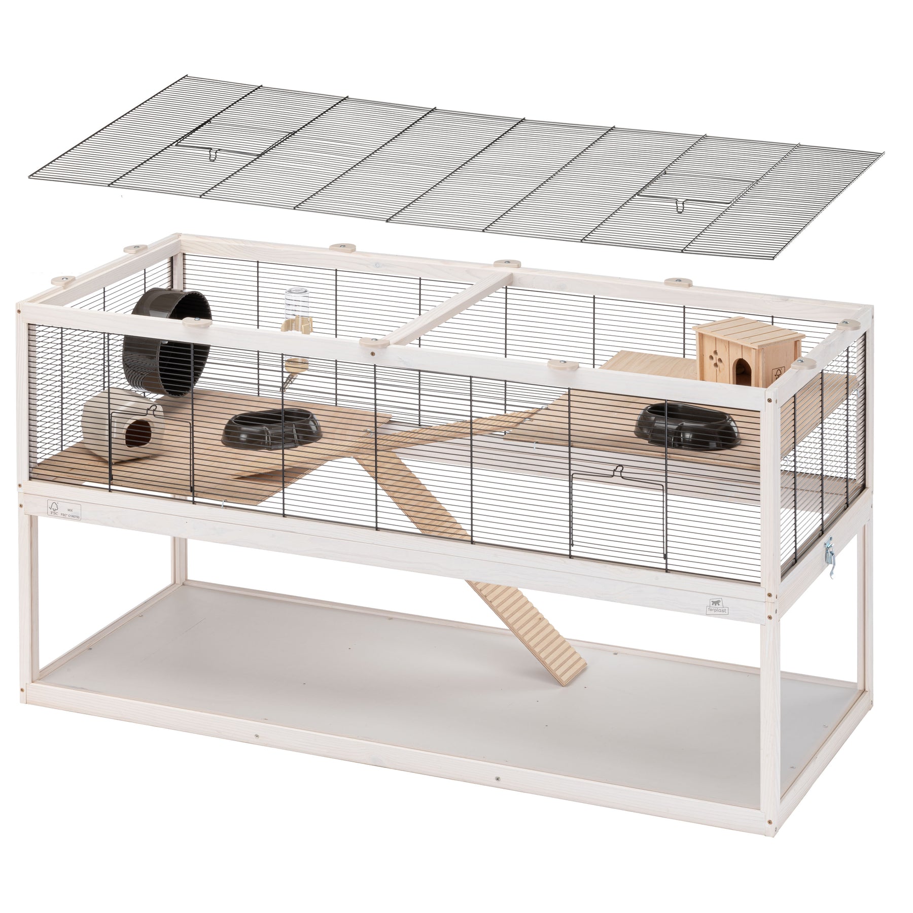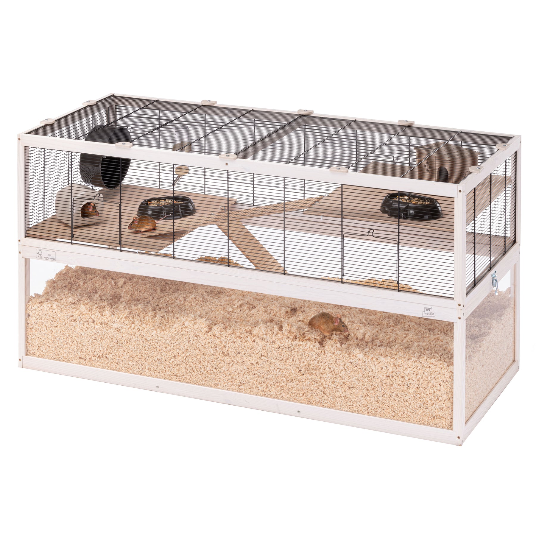 Im Inneren ist jedes Domster-Habitat mit Zubehör ausgestattet, um Ihrem Nagetier den nötigen Komfort zu bieten: Dieses Modell umfasst einen Holzkäfig und einen Kunststoffkäfig zum Ausruhen, zwei Futternäpfe, ein Laufrad für die Bewegung und eine Trinkflasche mit Ausguss aus Edelstahl.