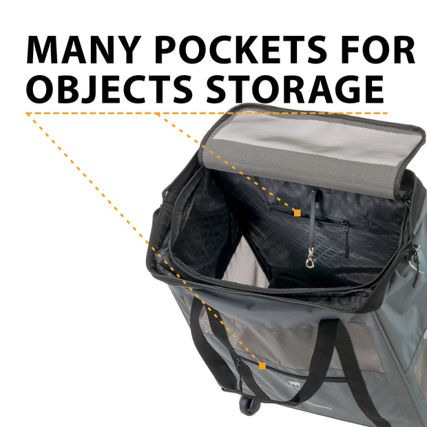 Transport-Trolley für Hunde und Katzen, robust, kratzfest und wasserabweisend. Ausgestattet mit einem Teleskopgriff, abnehmbaren Rädern, verstellbarem Schultergurt und integriertem Sicherheitsgurt. Mit geräumigen Mehrzwecktaschen und integriertem Namensschild.