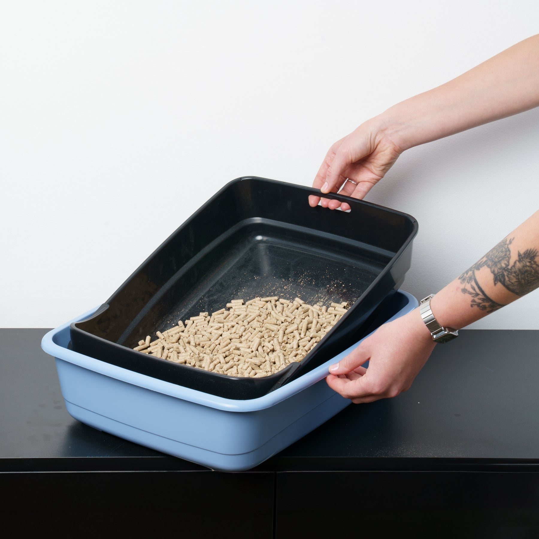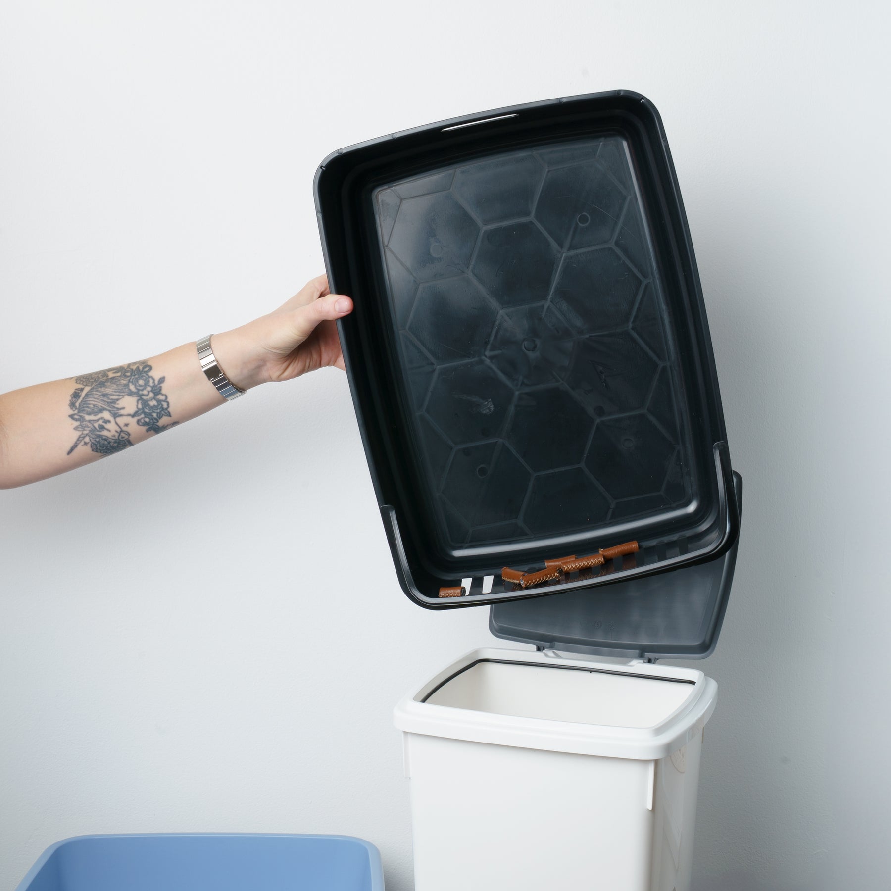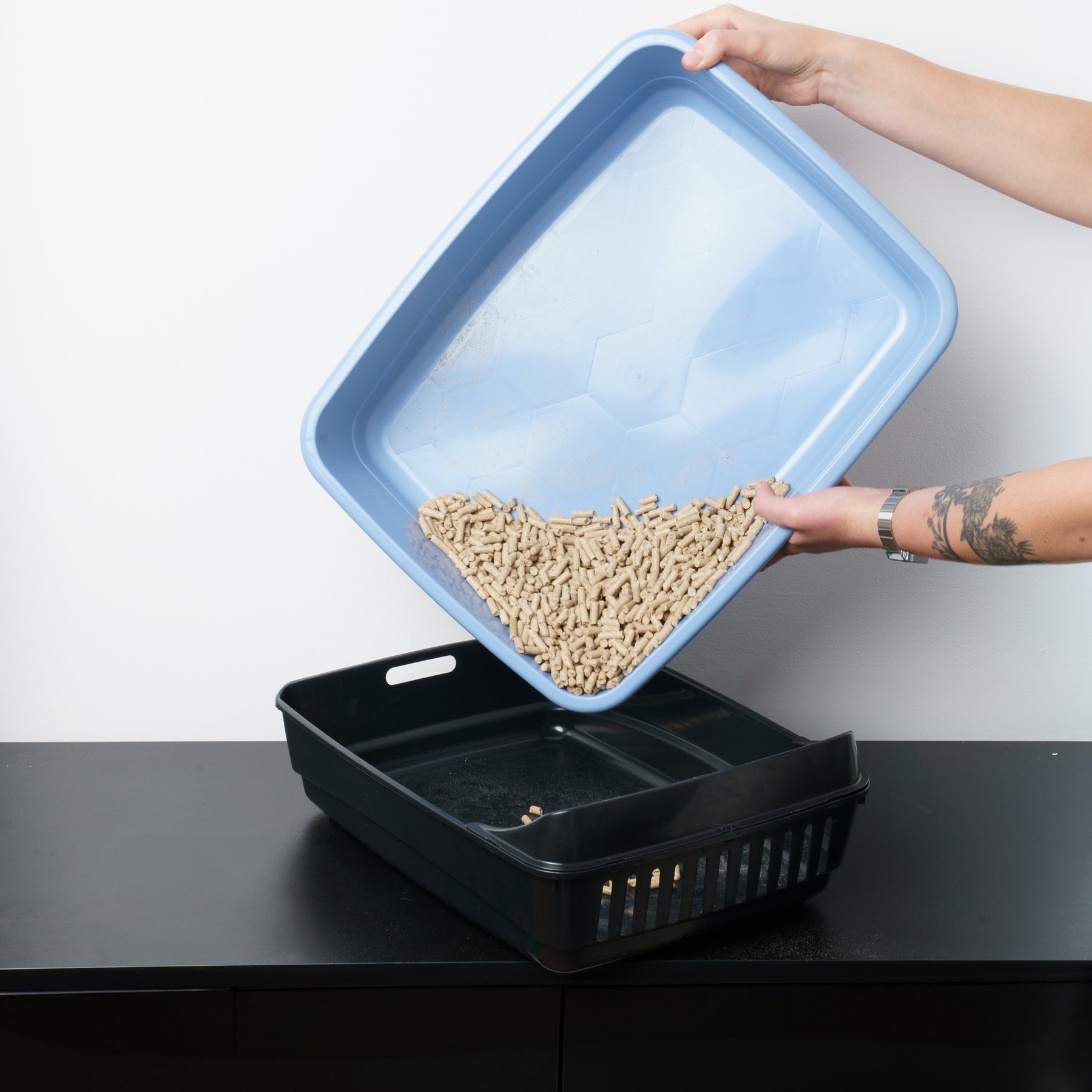 Um die verschmutzte Streu zu entfernen, gehen Sie einfach wie folgt vor: Heben Sie den perforierten Boden an und sieben Sie den Sand, im Sieb verbleibt dann nur das geklumpte Streu und der Unrat der entsorgt werden soll. Die Streu im Standardboden können Sie weiterverwenden und mit neuen Sand auffüllen.