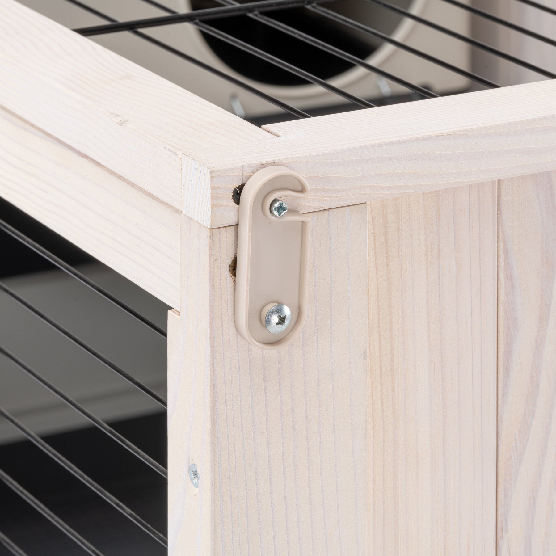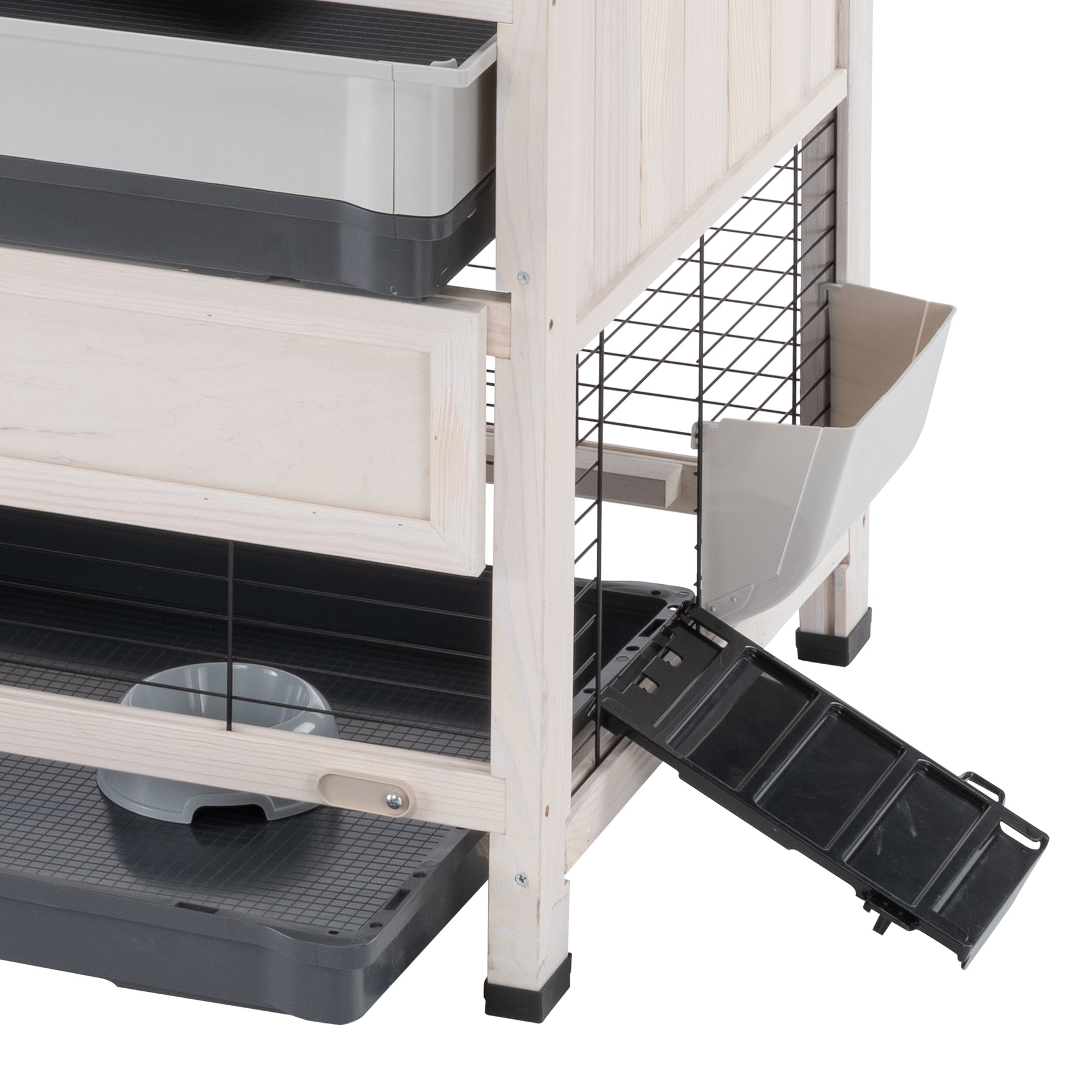 Der Kaninchenstall ist einfach zu reinigen dank des vollständig öffnenden Daches und der herausnehmbaren, sehr geräumigen und praktischen Kunststof hubladen. Die obere Schublade wird von einer Holzklappentür verdeckt, die mit einem Haken verriegelt werden kann. Der Zugang zum Untergeschoss kann mit der Rampe während der Reinigungsarbeiten verschlossen werden, die hohe Wanne hält die Streu zuverlässig zurück.