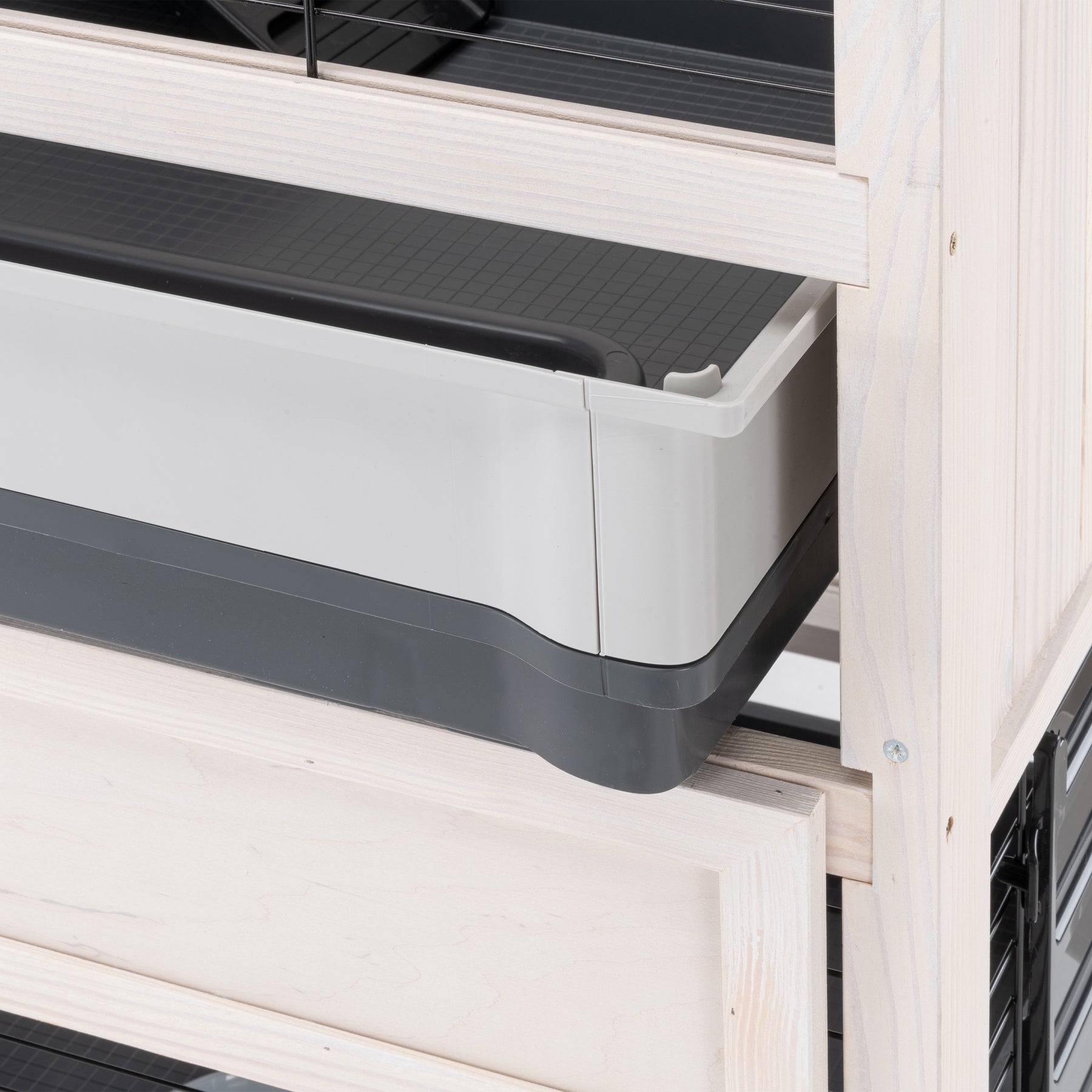 - in der unteren Ebene findet sich ein Gehege mit einer Sicherheitsschließtür und einer ausziehbaren Schmutzfangschale