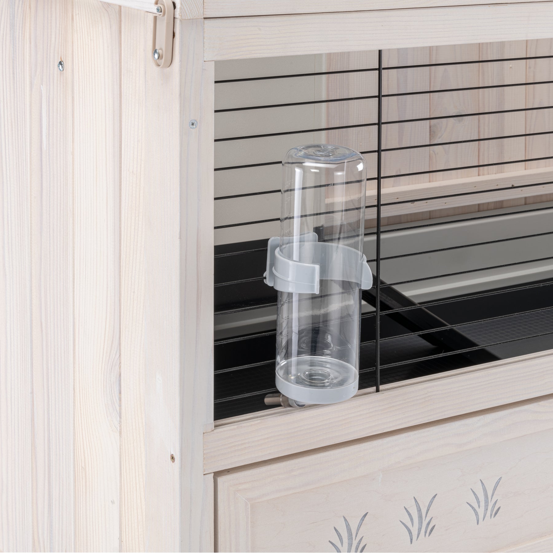 Da Cottage Largeauf zwei Etagen aufbaut, bietet es dem Tier viel Platz und Bewegungsfreiheit. Im unteren Teil wurde beispielsweise ein Gehege angelegt, mit einer Schiebetür, die Sie öffnen können um Ihren kleinen Freund herauszulassen. Die Tür ist selbstverständlich mit einem Sicherungshaken fest verschließbar. Der Kaninchenstall ist voll ausgestattet, damit Ihr kleiner Freund dort sofort einziehen kann. Er ist mit einer Trinkflasche, einer Schüssel und einer Heuraufe aus Kunststoff ausgestattet. Eine bequeme leiter bietet Zugang zum Obergeschoss, wo sich ein etwas geschützterer Bereich befindet, der mit einer tiefen Kunststoffwanne ausgestattet ist, die zuverlässig die Streu zurückhält, und einem komfortablen Kaninchenhaus, das über eine kleine Rampe erreichbar ist. In diesem bequemen Nisthäuschen kann das Tier sowohl nachts als auch tagsüber ungestört ruhen. Das Haus verfügt über ein Klappdach, das einen einfachen Zugang für die tägliche Wartung ermöglicht.