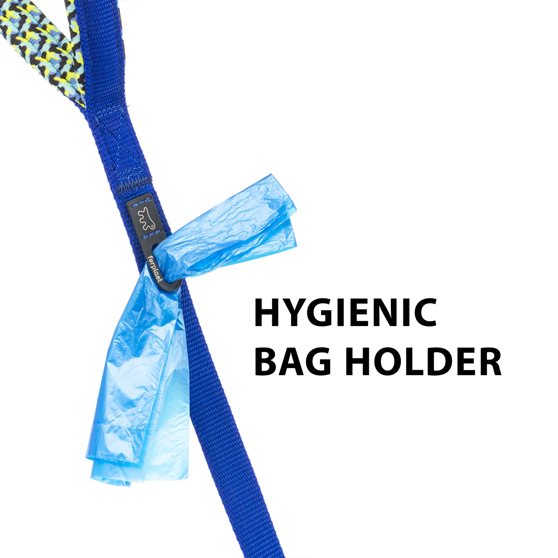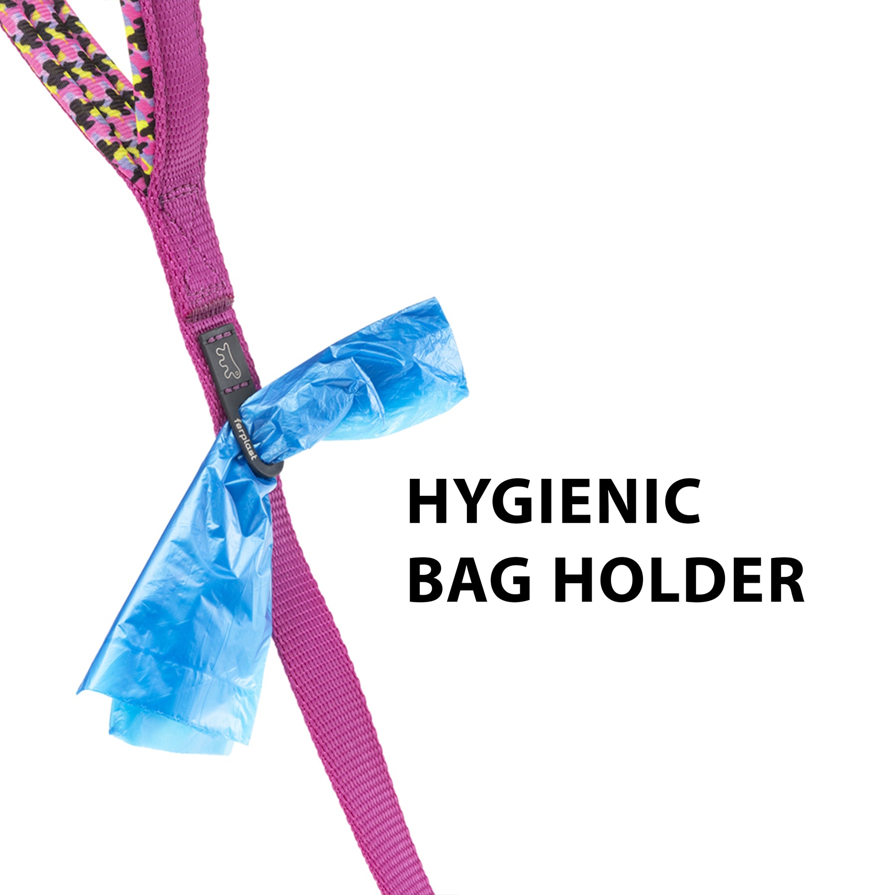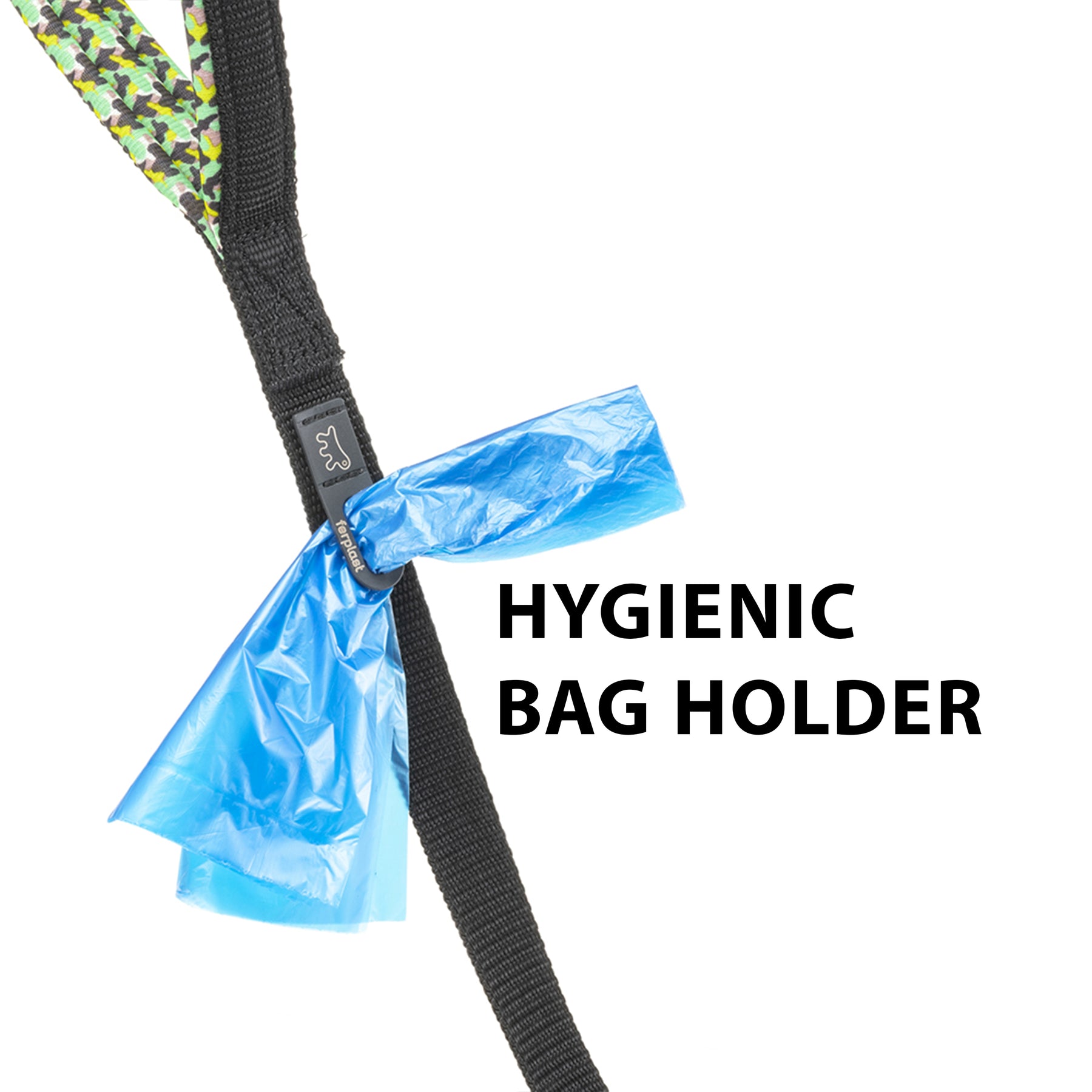 Es ist auch mit einem praktischen Hygienetaschenhalter ausgestattet, der in den Gurt integriert ist. Dies ermöglicht eine große Bequemlichkeit bei Spaziergängen mit Ihrem Freund, da Sie die Tasche leicht aus dem speziellen Ring herausziehen können, ohne sie in Ihrer Tasche zu suchen.