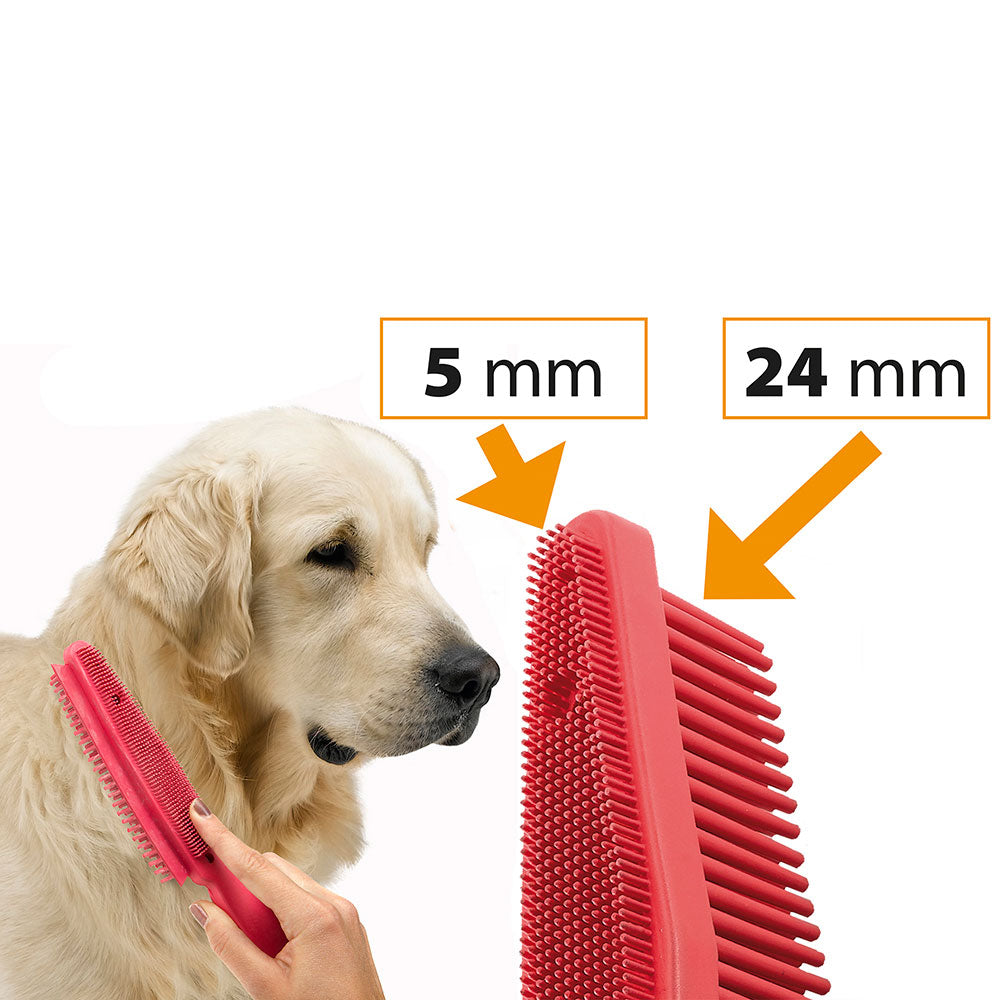 GRO 5941 ist eine Gummibürste für Hunde. Ideal auch zur Entfernung von Tierhaaren aus Polstern und Autositzen. Mit 2 verschieden großen Bürstenköpfen, einmal 5mm und einmal 24mm für unterschiedliche Felllängen. Der Haltegriff in Form einer Pfote hat ein Loch um die Bürste aufzuhängen.