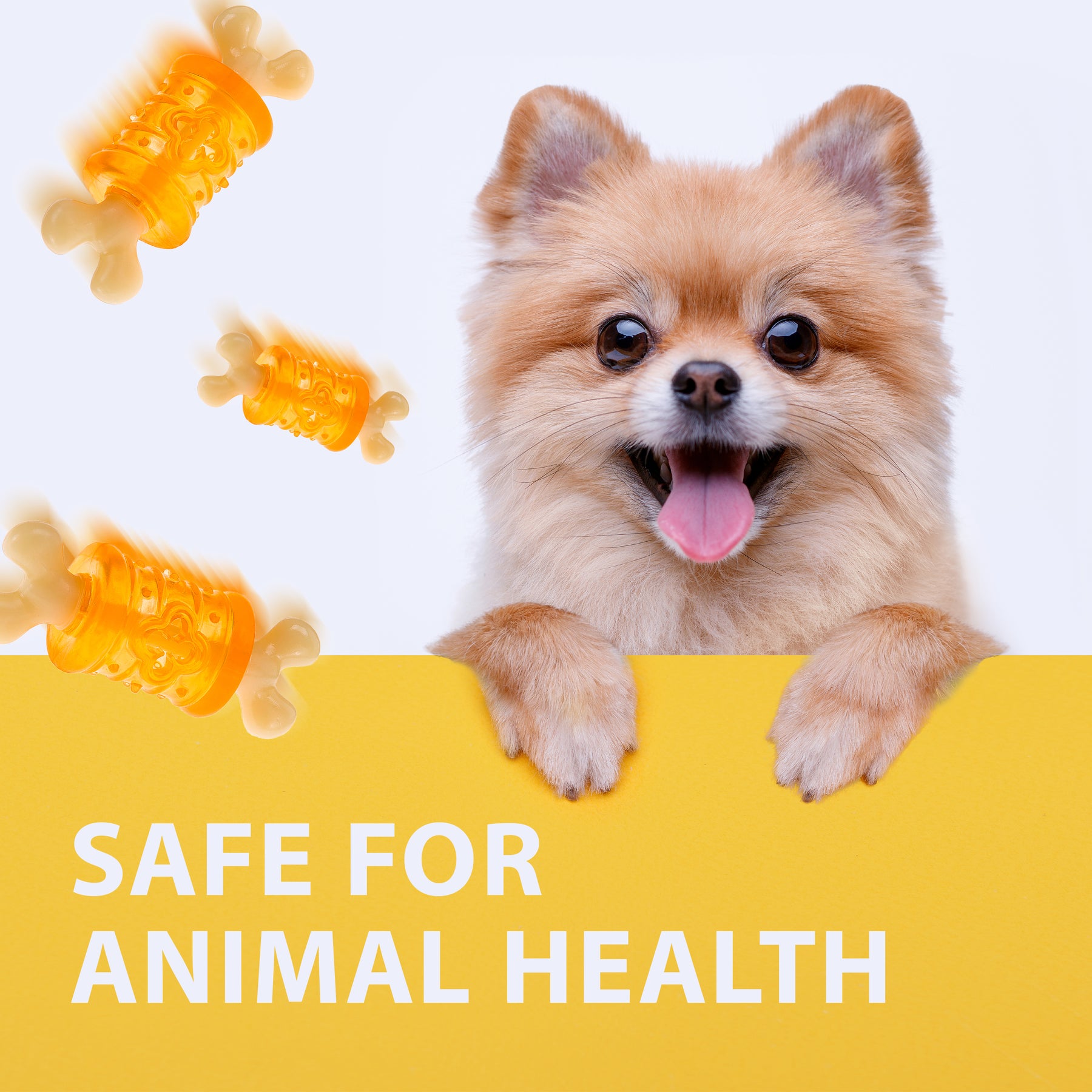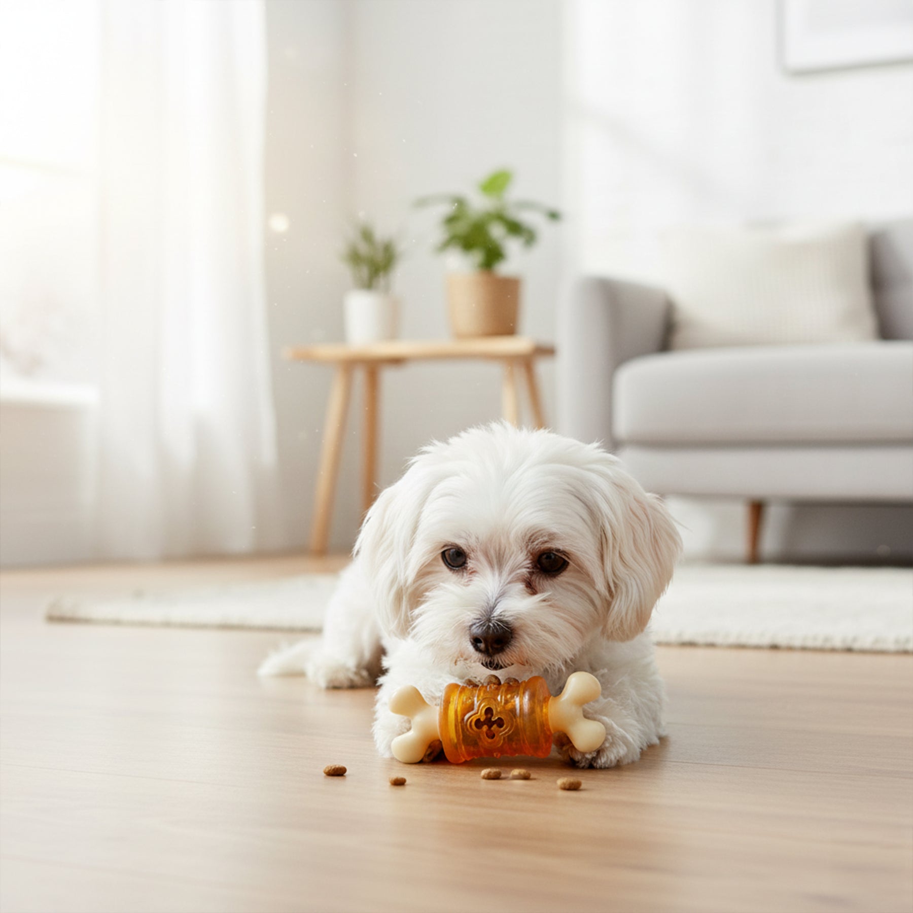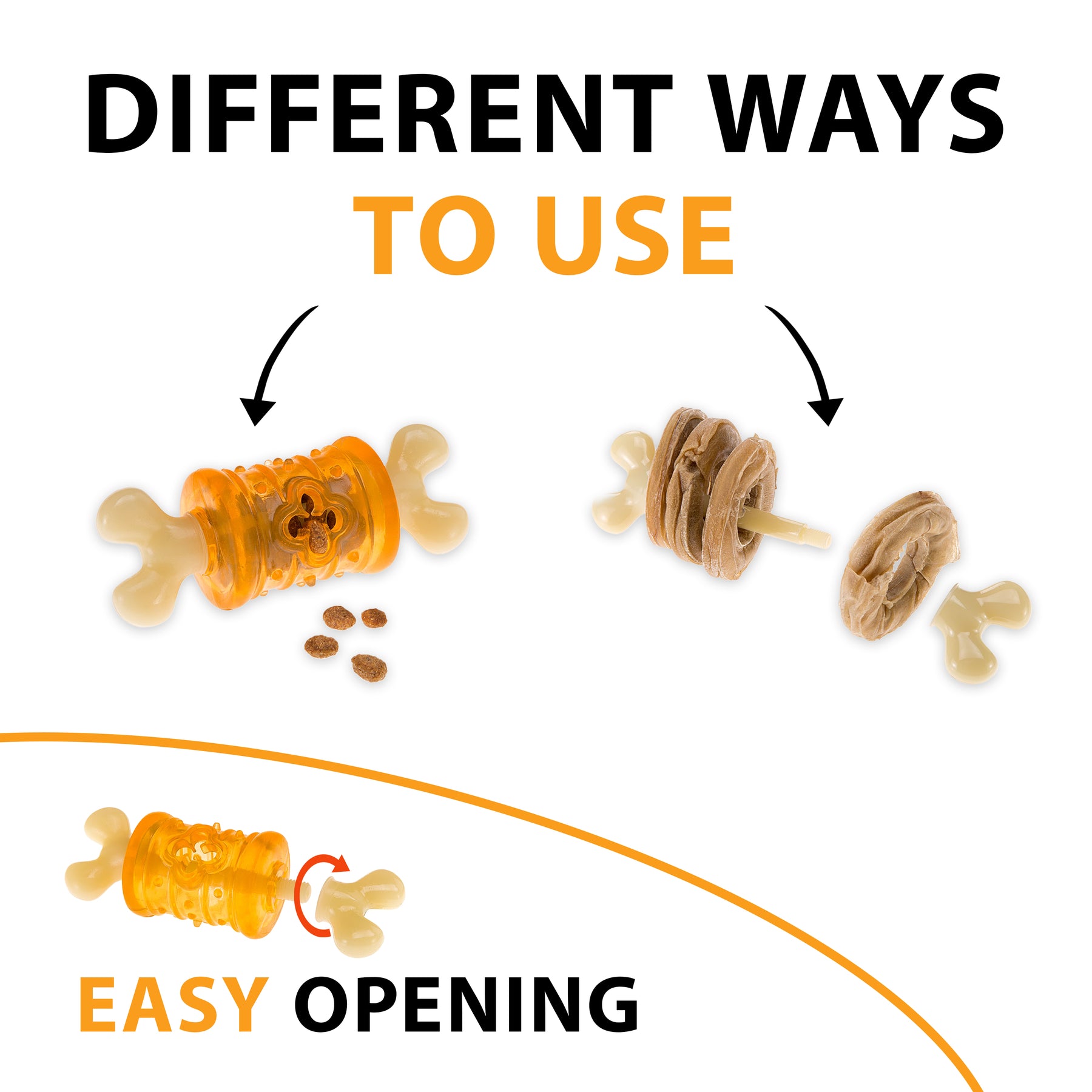 - Es ist wie ein Knochen geformt und gibt Knabbereien oder Futter aus, während das Tier damit spielt