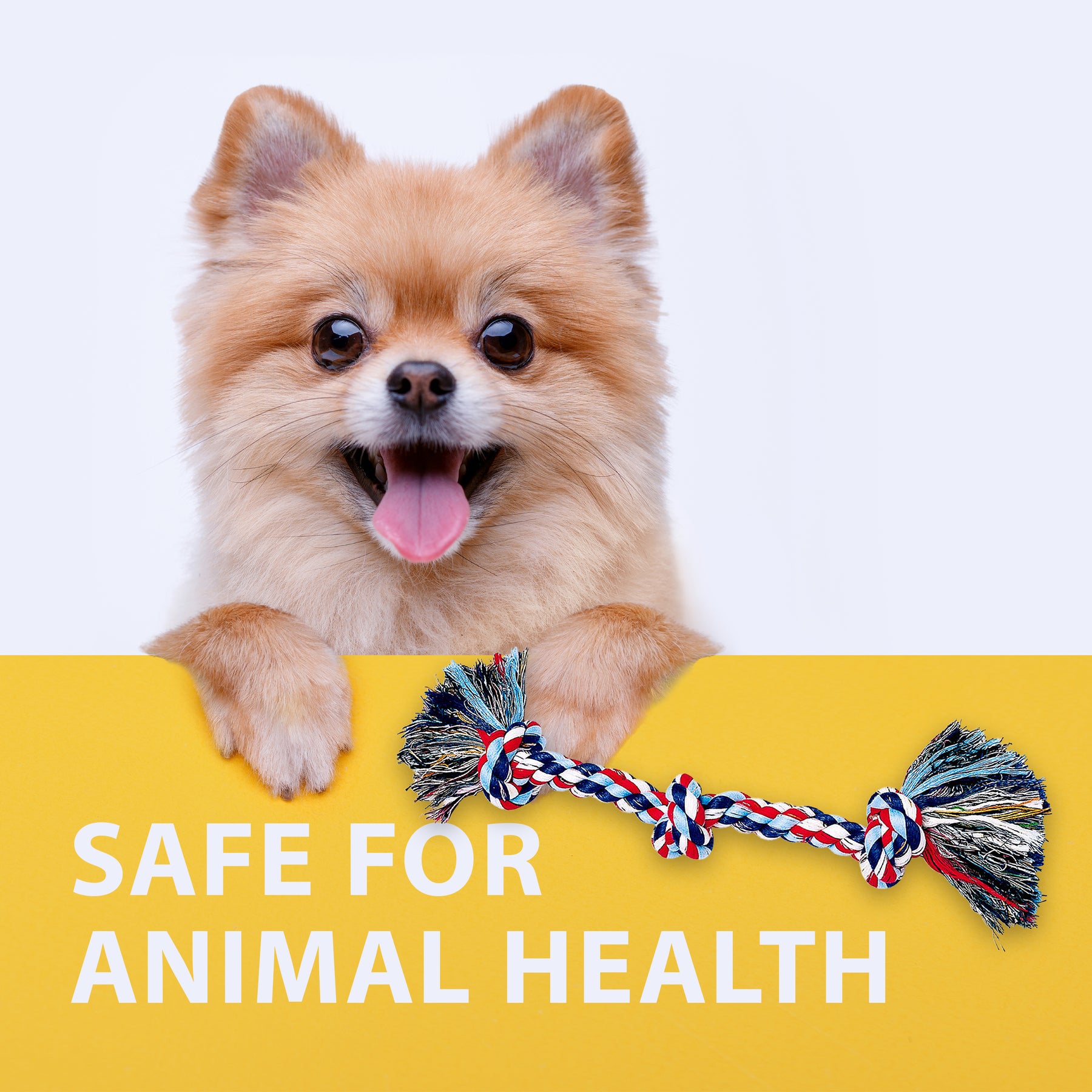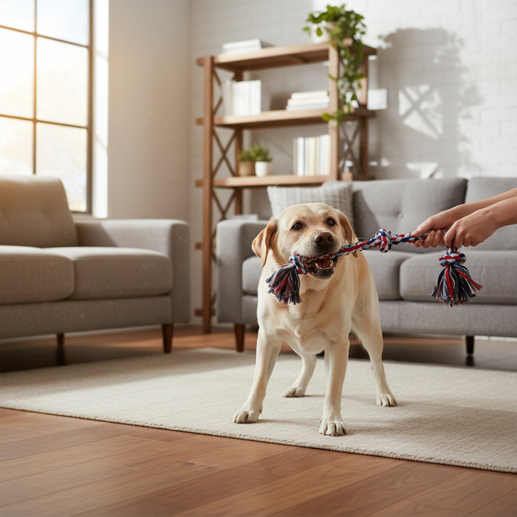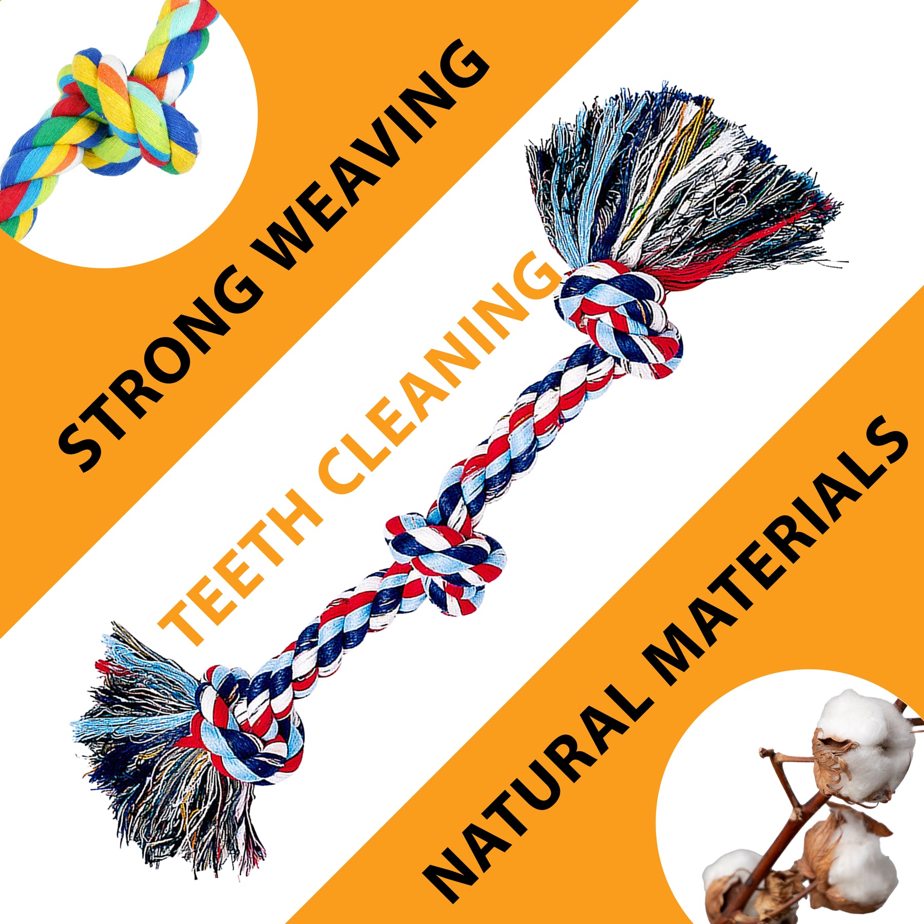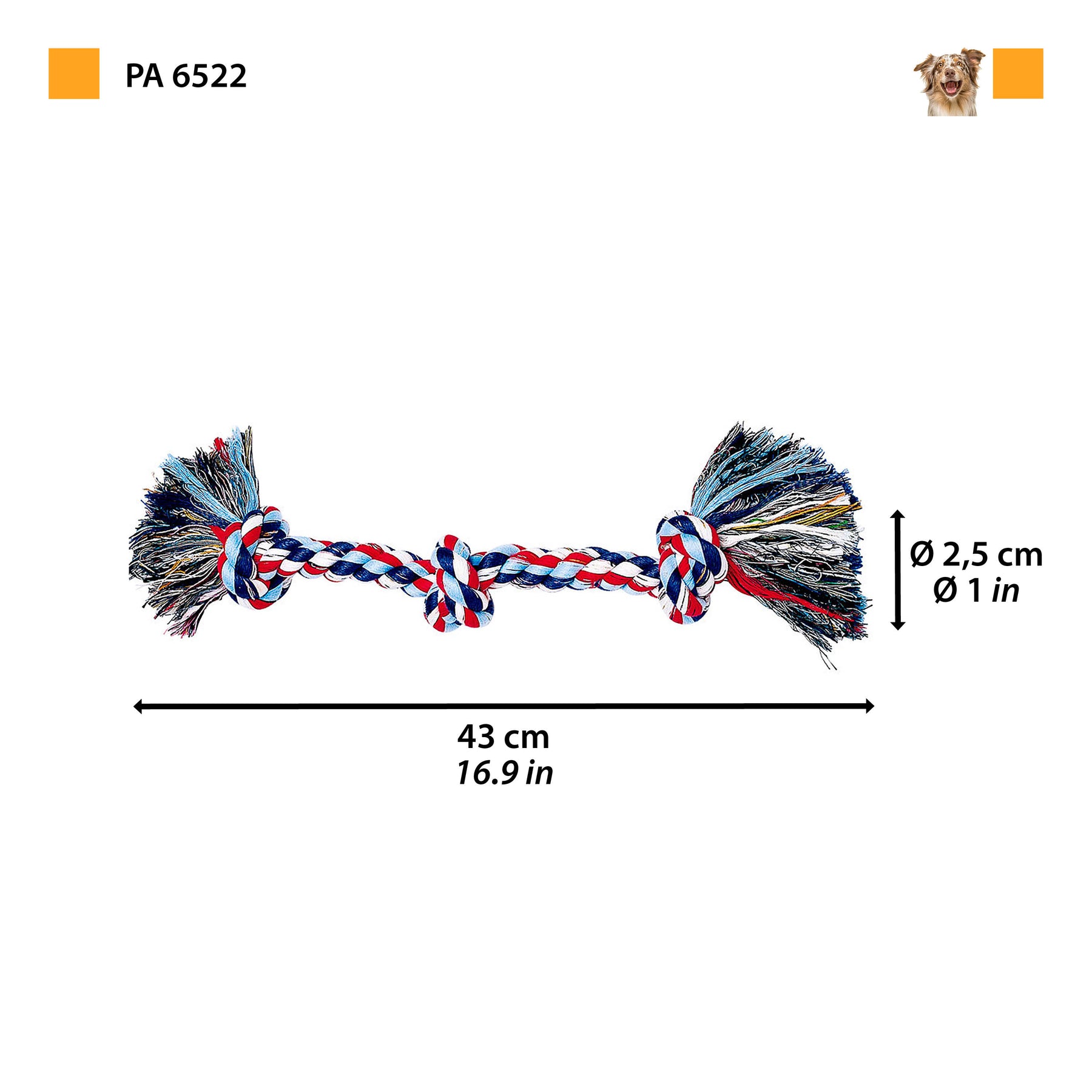 Spieltau aus Baumwolle mit Knoten in der Mitte und an den Enden für wilde Zerrspiele mit Ihrem Hund. Baumwollspielzeuge wie dieses sind eine gute Alternative zu den herkömmlichen Hundespielzeugen aus Gummi oder Latex.