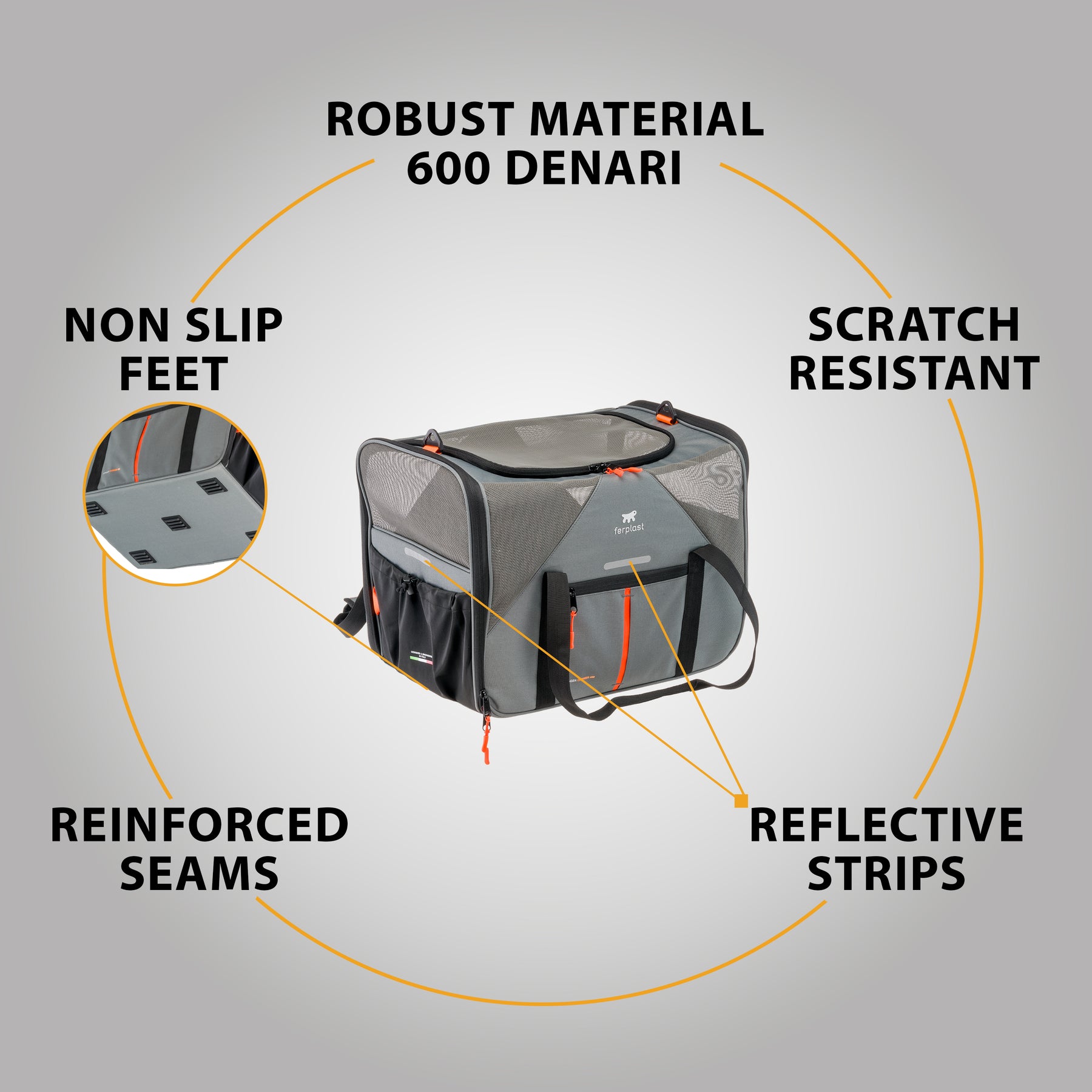Hergestellt aus 600-Denier-Polyester mit PU-Beschichtung, kratzfest, langlebig und wasserabweisend, ist diese Transportbox für Hunde und Katzen auf Langlebigkeit ausgelegt, selbst bei häufigem Gebrauch. Die robuste Struktur und die rutschfesten Füße gewährleisten Stabilität auf jeder Oberfläche, während das weiche, abnehmbare und waschbare Innenkissen aus Kunstfell für maximalen Komfort während des Transports sorgt.
