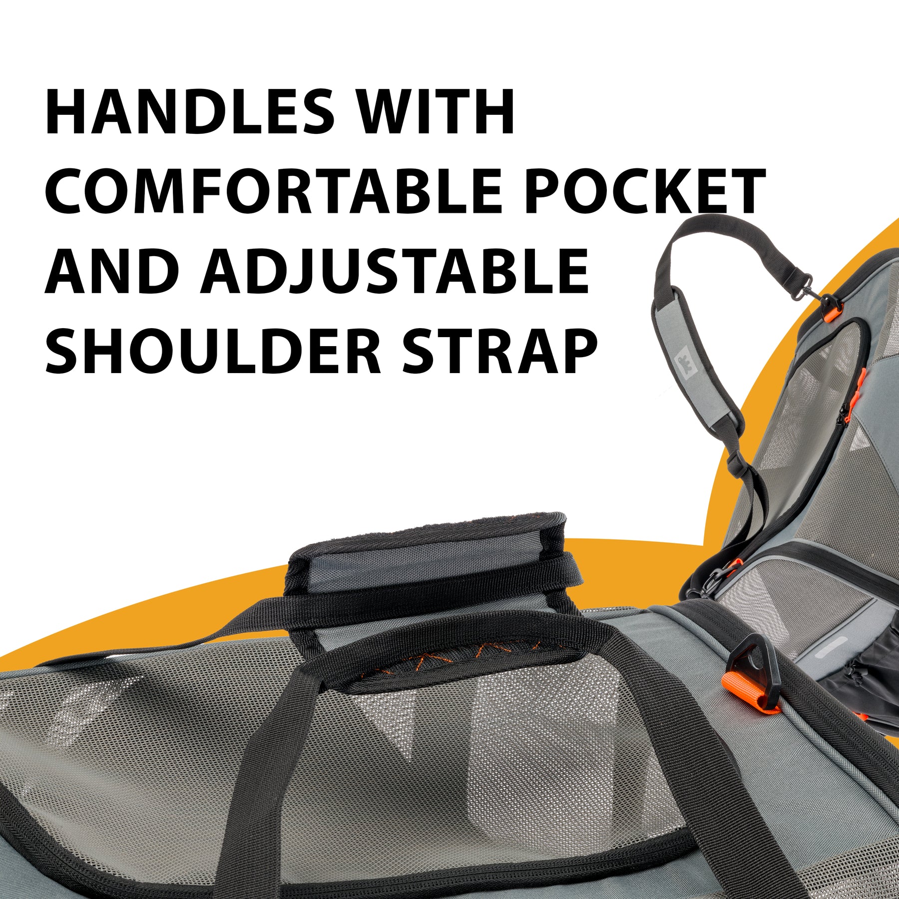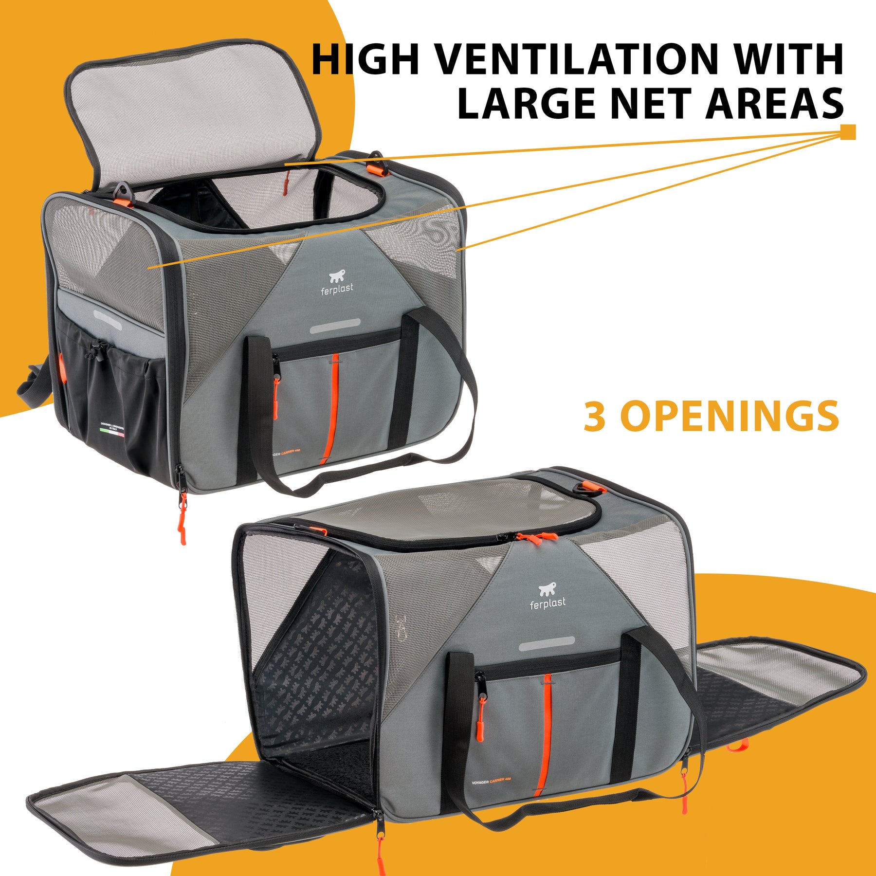 Ein Highlight sind die großzügigen Öffnungen an beiden Seiten, die mit robusten Reißverschlüssen ausgestattet sind, um den Zugang zu erleichtern und den Ein- und Ausstieg Ihres Hundes oder Ihrer Katze zu vereinfachen. Der obere Teil ist mit einem klappbaren Sicherheitsnetz versehen, das nicht nur den Zugang erleichtert, sondern auch die Belüftung verbessert und ein einladendes und gut durchlüftetes Umfeld für Ihr Haustier schafft.